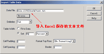 图1 在Excel中将此工作表存为Txt文件 然后启动Dreamweaver,在需要插入此数据表的地方单击鼠标,然后在“File”菜单下选择“Import”中的“Import Table Data…”,单击“Browse”,选择存好的Txt文件,单击“OK”按钮(图2)。