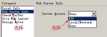 Server Info”项,右侧列出了有关网络服务器的一些信息。在“Server Access”的下拉列表框中选择FTP模式(图3),在“FTP