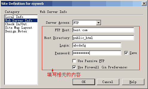 Host”框中输入上传站点文件的FTP主机名,这里输入“best.com”。接下来在“Host Directory”框中输入远程站点的主机目录名,“public_html”。接下来输入注册名及口令,申请网站时相关部门会给你登录的名字和口令。输入的口令会自动保存,如果不选中“Save”复选框,则每次与远程服务相连的时候都会提示输入口令。为了安全,我们一般选中“Use