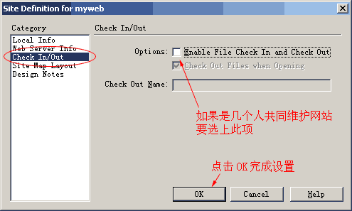 在Category列表框中选择“Check In/Out”项,如果是几个人共同维护网站,都可以上传文件时,可选定“Enable