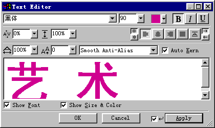 ●逐步说明: 1)选择工具栏中的文字工具,用鼠标点击工作区的适当位置,弹出文字输入框,输入文字“艺术”,并设置其参数为如图所示,