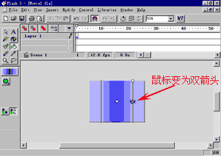 | 我们再来看一个带有遮膜效果的动画。下面我们来学习它的制作方法。点“新建”按钮,建立一个新文件。在键盘上按Ctrl+M,弹出动画特性对话框,我们将动画的大小定为320×240,背景选白色,点“OK”关闭对话框。  然后将编辑区移到画面中央。 我们先来做渐变的背景。 选择“铅笔”工具,再选择“画矩形”工具,拉一个与舞台编辑区大小相同的方框。  选择“漆桶”工具,单击fill color(颜色填充)按钮,弹出“颜色面板”,点单击面板最下方的“调色”按钮。  出现对话框,选择“Gradient(渐变)”标签。先来设置起始色,保证颜色渐变条左端的滑块为选中状态,在调色板的蓝色区域单击鼠标,调色板旁边的颜色条就变为以蓝色为主,向下移动黑色三角,起始色变为浅蓝色。选中结尾颜色滑块,我们需要结尾色与起始色相同,将起始色的R、G、B值输入到结尾色,渐变条成为单色。现在加入中间过渡色,将起始色旁边的黑色滑块拖到已有的两个滑块中间,新的颜色被加了进来,将其R、G、B值设为:40、36、134。 这儿的渐变方式刚好是设为Linear,设置好后关闭对话框。  在方框内单击鼠标,方框被填上渐变色,再双击它的边框,把边框删除。下面将渐变色进行一些修改。 选“漆桶”工具,单击“Transform Fill”改变填充按钮,单击矩形将其选中。 先把编辑区视图缩小到50%,这样便于观察。  将鼠标放在舞台编辑区右端白色小方块上,鼠标变为双箭头,按下鼠标向内移动,两边的浅蓝色区域增大。  将鼠标放在舞台编辑区右上角白色小圆圈上,鼠标变为旋转箭头,按下鼠标旋转,使标志线处于水平状态松手,渐变色成为由上至下的垂直渐变,按Esc键取消选择,这样背景就做好了。  再按两下Ctrl+Shift+W组合键还原到原来的视图。 |