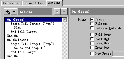 | 5)新增Movie Clip:text down。复制Movie Clip:text up,并命名为text down。更改第二个关键帧的Action为:Set Variable:"/:text.scroll"=/:text.scroll+1。即执行到第2格时,会告知场景上的Text Field(变量名为text)目前所显示的行数往下移一行。  6)安排电影场景: a 此例中有一块白色的区域是Text Field大小的范围,在上面还有一段文字“FLASH十全大补”。 b 放置Text Field:放置一个Text Field在白色区域的上面,设定变量名称为text。  c 将text up导入场景并定义实体名字为up;将text down导入场景并定义实体名字为down。  d 导入按钮:导入两个按钮btn_arrow,一个箭头朝上,一个箭头朝下。  e 设定箭头朝上的按钮的Actions为如图所示: 即表示按下按钮时,会告知text up播放,放开时,会跳回第1格并停止。  f 设顶箭头朝下的按钮的Actions为如图所示: 即表示按下按钮时,会告知text down播放,放开时,会跳回第1格并停止。  g 设定场景Actions为:Load Variables("text.txt",0)。即表示把变量载入到电影的场景里。  7)选择菜单Contrl->Test Movie,即可测试所制作的电影。 |