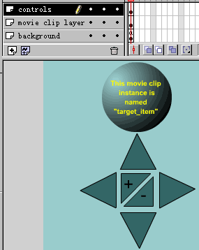 | ●预览成品:用鼠标控制一Movie clip移动、缩放、旋转。 下载源程序 ●逐步说明: 1)新建一文件如图所示: 其中在图层movie clip layer中放的是电影图符movie clip,在图层controls中放的是按钮left(向左的箭头)、right(向右的箭头)、up(向上的箭头)、down(向下的箭头)、grow(带有“+”的指向左上角的箭头)、shrink(带有“-”的指向右上角的箭头),在图层background中放的是场景中的背底图。 2)用鼠标右键点击movie clip,在弹出的菜单中选择“Properties”项,进入属性对话框,切换到Definition选项卡,在Instance Name域中输入实体名字“target_item”。  3)设置“left”按钮的Action为:  On (Release) Set Property ("/target_item", X Position) = GetProperty ("/target_item", _x)-5 Set Property ("/target_item", Rotation) = GetProperty ("/target_item", _rotation)-5 End On 即鼠标每点击一下该按钮,实体名字为“target_item”的movie clip向左移动5,并逆时针旋转5度。 4)设置“right”按钮的Action为: On (Release) Set Property ("/target_item", X Position) = GetProperty ("/target_item", _x)+5 Set Property ("/target_item", Rotation) = GetProperty ("/target_item", _rotation)+5 End On 即鼠标每点击一下该按钮,实体名字为“target_item”的movie clip向右移动5,并顺时针旋转5度。 |