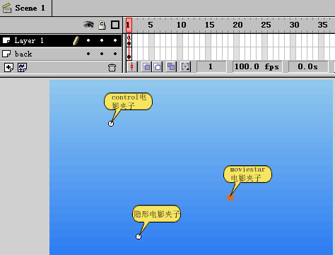 | ●预览成品: 下载源程序 ●逐步说明: 1)总体程序如图所示:  隐形电影夹子的实体名字为:start();moviestart电影夹子的实体名字为:star;control电影夹子的实体名字为:control。 现在我们先打开隐形电影夹子,发现里面什么也没有。  它在图层Layer1的第1帧(即程序一开始)被调用,主要起鼠标跟随的作用。  打开moviestar电影夹子如图所示:  即为一颗红色的星星绕白色的圆周一圈。 最后打开control电影夹子:  第1帧的Actions为: Comment: 复制夹子的总数 Set Variable: "i" = 36 Comment: 一圈内的夹子数 Set Variable: "n" = 12 Comment: 跟随快慢的系数 Set Variable: "r" = 3 Set Variable: "counter" = 1 Loop While (counter <= i) Duplicate Movie Clip ("/star", "star" & counter, counter) Set Property ("/star" & counter, Rotation) = 360-(360 / n) * counter Set Property ("/star" & counter, Alpha) = 100-(100 / i) * counter Set Variable: "counter" = counter + 1 End Loop Set Property ("/star", Visibility) = False Set Variable: "x" = GetProperty ("/star0", _x ) Set Variable: "y" = GetProperty ("/star0", _y ) 大体意思为:连续复制电影夹子moviestar,总数为36个,并设定每个相应的旋转角度和透明度;设定实体名字为star的电影夹子不可见;设定“X”、“Y”为隐形电影夹子的“X”、“Y”坐标值。 第2帧的Actions为: Set Variable: "counter" = 1 Loop While (counter <= i) Set Property ("/star" & counter, X Position) = GetProperty ("/star" & counter, _x ) + (GetProperty ( "/star" &(counter-1) , _x ) - GetProperty ("/star" & counter, _x )) / r Set Property ("/star" & counter, Y Position) = GetProperty ("/star" & counter, _y ) + (GetProperty ( "/star" &(counter-1) , _y ) - GetProperty ("/star" & counter, _y )) / r Set Variable: "counter" = counter + 1 End Loop 大体意思为:设定刚复制的36个电影夹子的“X”和“Y”坐标。 第3帧的Actions为: Go to and Play (2) 即与第2帧形成循环。 |