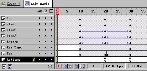 | ●预览成品: 下载源程序 ●逐步说明: 为了方便,我们先给出完整的程序,然后再逐一讲解。  1)该程序总共有两层:Main层和Control层。Main层中放的是实体名称为“main”的Movie Clip:main movie,里面包含各种状态下的下拉菜单及弹出过程。Control层中放的是实体名称为“controller”的Movie Clip:control movie,用来控制下拉菜单的弹出。两层都只包含一个关键帧,并在该帧上设置了Actions为:stop,即表电影一播放就停留在该帧。 2)我们先看“Main”层。用鼠标右键点击工作区中的菜单,在弹出的菜单中选择Edit项,  进入main movie编辑模式。  3)在item1、item2、item3层中分别放的是按钮item1、item2、item3。top层中放的是上边条,bottom层中放的是下边条。Sec层中放的是次级菜单的按钮。Sec Text层中放的是次级菜单按钮上的文字。Actions层为程序控制层。 |
