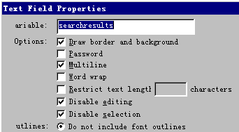| 3)选中第2个关键帧,这里也有两个文本框和两个按钮。  小文本框的属性为:  表示在此输入想查找的内容,大文本框的属性为:  表示在此输出查找结果。打开提交按钮属性对话框,切换到Actions选项卡,里面的程序为: On (Release) Set Variable: "Index" = 1 Set Variable: "found" = false Loop While (Index <= namecount and not found) If (Eval ("name" & Index) eq nametofind) Set Variable: "found" = true Set Variable: "searchresults" = "您要找的数据在第 " & Index & newline & newline & ( Index - 1) & ". " & (Eval("name" & (Index - 1))) & newline & Index & ". " & (Eval("name" & Index)) & newline & ( Index + 1) & ". " & (Eval("name" & (Index + 1))) Else Set Variable: "Index" = Index + 1 End If End Loop If (found = false) Set Variable: "searchresults" = "没有您要找的数据……" End If Set Variable: "nametofind" = "" End On 该段程序表示查寻输入的信息,如找到了,则在大文本框中显示,如找不到,则显示“没有您要找的数据……”信息。打开后退按钮属性对话框,切换到Actions选项卡,里面的程序为如图所示:  表示回到第1帧。 |