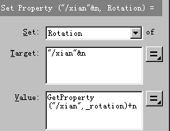 ,选Set Property(设置电影片断的属性)。这是Actions中用到的最频繁也最重要的语句之一。我们来设置新复制的电影片断的旋转属性。 在Set下拉框中选Rotation(旋转),Target为要设置属性的电影片断,填上"/xian"&n。Value用来指定改变后的属性值。其中GetProperty用来获取指定对象的相关属性,在这里我们将得到电影片断xian的旋转角度值,以度为单位。这样设置的作用是把新复制出来的电影片断"xian"&n做一个旋转,其旋转角为电影片断xian旋转角度加上n的值。
