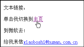 单击 “确定”按钮.超链接就制作成功了。 我们切换到预览模式(单击预览按钮), 当我们把鼠标指向“主页”两字时鼠标变成手形,单击它,我们就切换到主页了。 那么为什么不在普通模式下试呢?:因为普通模式主要是用来编辑网页的,当我们在普通模式把鼠标指向“主页”两字时鼠标没有变成小手状,因此不能进行页面切换。 不过如果按住CTRL键,鼠标就变成了小手状。这时单击就可以进行切换了。也就是说在普通模式中按住CTRL键才能激活超链接。 我们也可以将超链接指向其他站点的网页。选中作为超链接的文本,单击“常用”工具栏的“超链接”按钮 ,这和选择插入菜单的超链接命令是一样的。