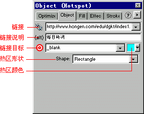 | 一、 设置热区 Fireworks 3提供了三种热区设置工具:矩形热区工具 ,圆形热区工具 以及多边形热区工具 。 下面我们就运用这三种工具分别为图片设置热区: 打开一副图片:llt.gif,单击矩形热区工具 ,然后拖动鼠标就可以为人物(李白)设置一个热区(如图1),但是设置的热区只能缩放,而无法倾斜和变形;  图1 热区 切换至圆形热区工具 ,拖动鼠标为小亭子设置一个热区,单击“变形工具”,拖动手柄适当地改变一下热区的大小,我们就发现圆形热区产生了多个控制点,接下来选取“细部选取工具”,拖曳这些控制点,使热区能够符合背景图形的造型(如图2)。  图2 变换热区形状 切换至多边形热区工具 ,以点选的方式,来产生多边形的每一个控制点,如此我们就可以为诗句勾勒出一个多边形的热区(如图3)。 图3 多边形热区 如果我们想隐藏热区该怎么办呢?其实Fireworks 3预设了一个图层----Web Layer层专门用来存放热区;当Web Layer层最左方出现眼睛图标(如图4)时,表示该层处于显示状态,如果想隐藏热区,只需单击眼睛使它消失即可。  图4 Layers浮动面板 Web Layer层是一个十分特殊的图层,我们无法更改它的名字,也无法删除该图层,但是可以任意调整该层的位置。 二、 设置URL链接 完成热区设置后,我们就需要指定该热区所链接的URL,这样浏览者单击鼠标后,才能开启指定的网页画面。 下面我们就为人物“李白”添加一个链接:单击该热区,然后开启“Object”面板,在链接栏中输入它的URL://www.gdjyw.com/edu/dgkt/index1.htm;我们还可以在“<alt>”栏中为此链接加上说明文字:每日诗词;为了让浏览者在打开热区链接后,还保持有原来的页面,我们可以将Link target选项选为:_blank ,这样单击热区后,会打开一个新的窗口。另外,单击“Shape”下拉列表按钮和热区颜色下拉列表按钮我们可以选择热区的形状和颜色。(如图5) 图5 热区链接设置 三、 善用URL面板 当网页中有很多链接时,利用“Object”面板一一输入就十分麻烦,这时我们就可以利用URL面板快速地为热区指定链接。 在“Library”选项中所显示的是目前使用的URL资料库(URLs.htm),该资料库所包含的URL都会列在下方的清单中,如果我们是第一次使用URL面板,则清单中并无任何URL资料。(如图6) 图6 URL浮动面板 那么我们如何将URL输入到资料库中呢? 1.从无到有输入URL 单击新建按钮(如图7),弹出“New URL”窗口,输入URL后,单击“ok”按钮即可。 图7 输入URL 2.从已有的URL来建立新的URL 选择想要修改的URL,然后单击“URL”面板右上角的如图按钮,在弹出菜单中选择“Add URL”,将弹出“New URL”窗口,修改完URL后,单击“ok”按钮即可。(如图8) 图8 添加URL 3.输入网页中的URL 我们可以将某个网页中所有链接导入到目前的资料库中。 首先选择“选项”菜单中的“Import URLs”指令,然后在弹出的“打开”窗口中选择我们想要导入的html文件:index.htm,单击“打开”按钮即可。 4.将热区的URL加入资料库 如果想把用“Object”添加的URL导入到资料库中,我们只需选取“选项”菜单中的“Add Used URLs to Library”指令即可。 现在我们就可以为热区添加链接了,单击热区,然后选取资料库中相应的URL即可,是不是很简单!此外,我们还可以配合“Object”面板来检查URL是否添加正确。 上一节 下一节  谈谈您的看法 |
