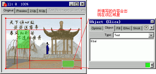 | 大家在上网的时候,可能会经常碰到这种情况:浏览某个网页的时候,大部分内容已经下载完毕,唯独一副大图迟迟不肯露面,让人等得很心烦!这也就是我们为什么要切割大图的原因了。 把大图切割成几个小图,会大大加快图片的下载速度;另外,切割图片还可以用于链接设定。 Fireworks 3可以轻松地将大图切割为几个小图: 首先打开我们要切割的图片,然后选择“Slice Tool” 工具,拖动十字架光标在图片左上角拖曳出如图的切割区域,这样图片就被分割成了三个区域。 在如图1的切割图片中,红色的线条代表的是切割线,而绿色的区块,我们可以设置URL链接,设置方法如同热区链接的设置。 图1 切割图片示例 如果我们不想在切割图片的时候产生链接区块,那么我们只需在选取“Slice Tool” 工具后,直接在图片中单击鼠标即可产生切割区域。 接下来,我们来调整一下切割区域的比例分配,选取“一般选物工具”,拖动某个切割区域(必须是拖曳产生的Image可链接区域),即可改变区域的个数和比例;另外,使用“一般选物工具”拖曳切割区域的控制点,也可以调整切割区域的比例。(如图2) 图2 调整切割区域 大家可能会问:热区是存放在Web Layer层的,那么切割区域存放在什么地方呢? 其实,切割区域也存放在Web Layer层中,同样我们单击眼睛使它消失即可将切割区域隐藏;另外,单击图标 ,也可以将切割区域隐藏,单击图标 ,可以将切割区域显示。 下面我们为图片添加一些文字: 首先我们在图片的右下角拖曳出一个Image可链接区域,适当地调整它的大小和位置,然后开启“Object”面板,在“Type”选项中选择“Text”(文本),输入需要的文字(例如:li bai)即可(如图3)。  图3 输入文字 上一节 下一节  谈谈您的看法 |