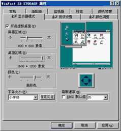 下面我们来讲字体:在高分辨率下,字体变小了,是不是看起来很费劲?所以,在分辨率高于800×600的情况下,很多显示卡给我们提供了大字体显示方式。你看,这是800×600分辨率下的小字体显示: 我们来把它改成大字体。还是先打开“显示器属性”对话框,在桌面上单击鼠标右键,选择“属性”,点一下“设置”选项卡,再点一下“高级”按钮,在弹出的对话框中有一个“常规”选项卡,这里的“字体大小”栏就是我们改变Windows95/98系统字体大小的地方,我们在下面的列表中选择“大字体”,然后再点“确定”关闭“显示器属性”,系统提示我们,必须在重新启动Windows95/98后,才能使改变的设置有效,点“是”重新启动。瞧,现在Windows己经是用大字体显示了: