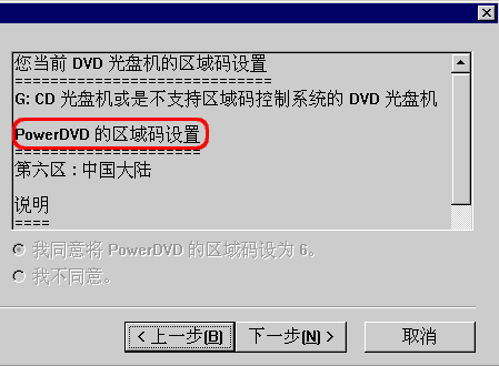 2.PowerDVD 安装 PowerDVD是一个质量比较高,而且是纯粹用软件解压播放DVD电影的比较优秀的工具软件,它具备了以往VCD播放器的绝大部分功能,如快进、暂停、步进、捕捉画面等等很多功能。它能把DVD电影的所有优点表现得淋漓尽致。 当然,PowerDVD对硬件的要求也不低,它所需要的最低硬件配置是: CPU最少要在P-II 266或赛扬300A以上 而且操作系统最好是Windows98,这样才会更好地支持DVD播放。 那么我们现在就来说一下PowerDVD吧。 当然啦,首先一步就是它的安装,我现在用的显卡是WinFast320,它自身就带了PowerDVD的安装光盘。把光盘放进光驱,安装向导开始自动运行,出现了PowerDVD安装对话框,点“下一步”,阅读协议后,点“是”继续。 接下来是用户信息和CD-KEY,CD-KEY就在光盘的外包装上,输入CD-KEY,点“下一步” 。 然后就要确认您当前 DVD 光盘机的区域码设置,因为我的DVD光盘机默认为“中国大陆”的区域码,所以下面的“我同意将PowerDVD的区域码设为6”和“我不同意”的两个选项都为灰色,而且无法修改,所以DVD影片的区域码必须与DVD光盘机区域码相同才能够正确的播放。