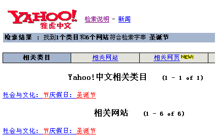 ☆中文YAHOO Yahoo是世界上最著名的搜索引擎。它的界面简洁,功能却十分强大。现在,Yahoo推出了中文查询站点,为我们这些中国网虫提供了一个有力的工具。 中文Yahoo的网址是: //gbchinese.yahoo.com为了便于按类别搜索,Yahoo把浩翰的网页进行了分类,按休闲与运动、社会与文化、电脑与网络、政府与政治……等等信息类,我们可以在相关的类别中查找相要的信息,也可以直接在它的搜索框中输入我们想要查找的关键字,来查找。比如我们来查一下“圣诞节”,先打开浏览器。在地址栏中输入 //gbchinese.yahoo.com 看,中文Yahoo就在面前了,我们在这个搜索栏里写上“圣诞节”,然后按一下旁边的“Search”按钮。