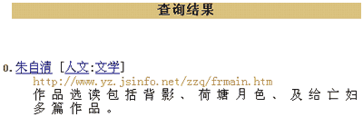 但是在查找完后,我们会看到,在结果中这两个关键字并没有同时出现,也就是说,对第一个关键字会响应得最快,第二个关键字有可能不会出现。在YEAH搜索引擎中,最能突出的是在文学方面的资料的搜索,例如我们想找一下几个有名的文学家鲁迅、朱自清,只要输入名字,马上就可以找出来。