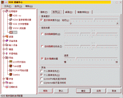 | 4.4 选择颜色主题和背景 桌面配置部分决定了你所希望的桌面外观,在KDE里你能为你的图形环境选择许多种不同的背景颜色、墙纸图形和窗口颜色主题的一种。 注意:颜色、屏幕保护和其它信息的设置被保存在你的主目录里。如果别的用户登录到你的Linux 计算机并启动KDE,该用户将不能使用你的桌面设置,KDE的默认将一直起作用,直到它们被改变,而不是对整个计算机系统起作用。 本节所描述的特点可以通过选择主菜单里的设置|桌面项|,或者使用控制中心的桌面部分(从主菜单中选择KDE控制中心)。KDE控制中心显示在该图形界面中。 如何选择背景颜色 1. 从适当的面板图标中打开KDE控制中心,或从KDE主菜单中选择它。 2.选择控制中心的桌面部分的背景项(图4-5)  图4-5 你能在背景标签上逐个的设置每一个KDE虚拟桌面的外观 3.为之设置的背景颜色的桌面。 每一个桌面可以有不同的背景颜色和/或墙纸。 4.选择单色按扭,设定单色背景。 5.选择双色单选按扭来选定双色(渐变的或阴影的)背景。 6.点击任何一个或两个颜色条来设置该条的颜色。 一个选择颜色对话框将被显示(见图4-6),在这里你可以选定系统颜色的一种,或者定义你自己的用户色彩。  图4-6 该选择对话框将会在整个KDE中使用以帮助你为一个对象选择颜色 7.如果你选择了双色背景,那么选择设置按钮来选定两种颜色混合的方式(见图4-7)。  图4-7 在设置对话框中,你将定义如何混合两种颜色以创建一个KDE背景 注意:当你选择颜色和背景时,该对话框右上角处的预览窗口将显示桌面将会是什么样子。 如何为你的桌面墙纸图形 1.选择你想为之选定墙纸的桌面。 2.在桌面区的背景标签里找到对话框墙纸部分。 3.从最初显示"无墙纸"的下挂列表中为你的墙纸选定图形。 KDE包括了近100幅墙纸图形,如果你没见到你想要的墙纸,选择浏览按钮来选定你所创建或下载的图形作为墙纸。 注意:墙纸可以以多种标准的图形格式创建,包括xpm、jpeg和gif。 1.选择你所希望从下挂式列表中放置墙纸的方式。 例如,聚集在屏幕中间或平铺在整个屏幕上,你的选择依赖于你决定的图形风格。 2.选择应用来激活你的设置。 3.选择文件或退出来关闭KDE控制中心。 选择屏幕保护 当你使你的计算机闲置一旁时,屏幕保护可以启动防止显示器受损。KDE包含有许多屏幕保护程序,你能利用标准对话框选择并测试它们。 注意:因为一些显示器在无动作时适应于节能模式,所以你或许只有在测试时才能看到这些屏保程序。即使它看起来并不好看,但是它是一种节能的显示器使用方式。 如何选择KDE屏幕保护程序 1. 选择 设置|桌面|屏幕保护(或选择KDE控制中心里的桌面|屏幕保护区域)。 屏幕保护程序选择对话框出现(见图4-8)。  图4-8. 在屏幕保护对话框中,你可选择和配置KDE的屏幕保护程序 1.从屏幕保护程序的下拉列表中,选择你想适用的一个。 KDE 包含有许多屏幕保护程序。 2. 选择Setup按钮来设置屏幕保护操作。 例如,你可设置多少对象显示,或他们的移动速度。 每一个设置对话框都不同,依赖于你所选定的屏幕保护程序。 3.选择测试按钮来看一下屏幕保护程序被激活的情况。 移动鼠标或按下esc键结束测试。 4.在Wait域中,输入一个延迟秒数来决定在运行屏幕保护程序之前的等待时间。 5.如果你想给你的屏幕保护程序加锁,请选择Require Password 检查框。 当你离开办公桌,而你的屏幕保护程序运行时,这个选项将会屏蔽别的用户。 6.移动优先级滑动块来显示屏幕保护程序的优先级。 如果有其他程序运行,比如 spreadsheet recalculation, program compilation, 或database accesses请使用低优先级.屏幕保护程序的图形应是起伏的,但你的其他工作会有优先级。 7.选择OK 来设置屏幕保护。 设置桌面元素的大小和位置 许多KDE桌面元素能被设置成适合你的个人风格。例如,你能选择面板和任务条的大小位置。 如何选择面板和任务条的大小和位置 1. 选择KDE控制中心的应用程序区的面板(或 选择 主菜单上的设置|应用程序|面板)。 2.选择"面板"标签。(见图4-9)。  图4-9. 利用这些KDE控制中心功能设置面板和任务栏的位置 3. Location 区,选择你所希望的面板位置。 4.在Style 区,选择你所希望的面板图标。 小图标适合于低分辨率。(800*600) 普通和大图标使用同一个图标,但是大的将其放在一个更大的框里,这对于高分辨率将会是非常方便的。(1600*1200)。 5.在Taskbar 区,选择你希望的桌面任务栏位置。 如果你选择了Hidden,任务栏将不会显示。你仍可以使用ALT+TAB ,或窗口列表来切换。 6.如果想是面板或任务栏自动隐藏,改变Option标签。(见图4-10)。 当你不使用它们时,"Autohide 功能将把面板和任务栏移出。 当你把鼠标指向屏幕边缘时,他们又会出现。  图4-10. 在Option标签上设置面板和任务栏如何动作 7.在对话框的可视区里,选择AUTO HIDE PANEL 或 AUTO HIDE TASKBAR 去执行这些特性。 8.使用滑动块来决定当你移离面板和任务栏时,自动隐藏特性被激活的速度。 9.不选Tooltips菜单里的Show Menu Tooltips检查框,可以防止黄色弹出线索显示在面板图标和菜单项上。 在你还未熟悉KDE的图标和菜单项前使用菜单Tooltips非常有用。 介绍XteamLinux桌面图标 在安装XteamLinux3.0后启动X-Window时,你将看到桌面上有一些图标,它们是:我的电脑、我的因特网、我的办公室、我的多媒体、我的工作室、我的配置、回收