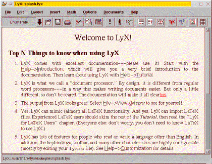 LyX 是所见即所得的中文排版软件, 是 LATEX的前端。使用 LyX 可以生成 LATEX文件和 PostScript 文件。LyX的功能十分强大, 它可以处理文本、图像、表格和数学公式等等。它的存储格式可以是 TEX, DVI, PostScript或文本格式。