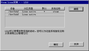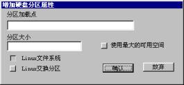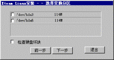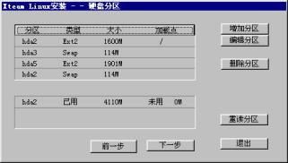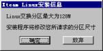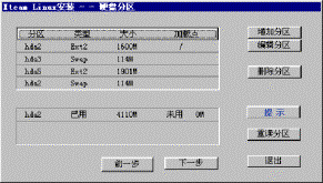 | 2.5 硬盘分区 2.5.1 硬盘分区 2.5.2 选择交换分区 2.5.3 格式化硬盘 你接下来会看到如图2-9一样的硬盘分区信息:  图2-9 硬盘分区 如果你对Linux的分区情况不甚了解,即使看了如下的介绍也不能正确分区,那么请按“提示”按钮,系统会根据你硬盘的情况自动分区,这时你只需单击“下一步”即可。 注意:你在这一步所做的工作其实并没有写硬盘,直到系统提示你“安装程序将要修改您的硬盘分区表,请您确认”,你都可以更改你的决定。 2.5.1 硬盘分区 首先进行硬盘的分区,这时屏幕上已经显示出你机器硬盘当前存在的每一个分区的情况,你可以根据你的想法删除分区、编辑这些分区或增加新的分区。 1.删除分区: 鼠标单击删除分区,屏幕提示如图2-10:  图2-10:删除分区 如果确定删除该分区,鼠标单击确定,否则放弃。 注意:确定此分区的程序和数据已经进行了备份! 直到系统提示将要修改你的硬盘分区表之前的操作是没有实际写硬盘的,如果你误操作删除了某个分区,还是可以恢复的。 2.编辑分区: 鼠标单击编辑分区,屏幕提示如图2-11:  图2-11 编辑硬盘分区属性 在分区加载点下填入你想加载的名称,例如:/usr,鼠标单击确认。 3.增加分区: 鼠标单击增加分区,屏幕提示如图2-12:  图2-12 增加硬盘分区属性 填入分区加载点,例如:/home; 填入分区大小,如:100(注意:不要填单位); 选择增加的分区是“Linux文件系统”还是“Linux交换分区”。 鼠标单击确认。 提示: (1) 必须选择一个分区做为系统的“根”,即必须有一个分区的加载点为“/”。如果你没有选择,屏幕将会出现如图2-13的提示  图2-13 系统的“根” (2)必须创建Linux交换分区,且最大为127M,如果你创建的交换分区大于这个数值,安装程序将修改你所请求的分区尺寸,屏幕提示如图2-14:  图2-14 交换分区 通常只需建立一个交换分区即可,而且由于各种硬盘的参数不同,会出现交换分区的最大值只能为125M或其它略小于127M的数值,出现这种情况是正常的。 (3)如果你选中了“使用最大可用空间”选项,那么你在“分区大小”中所填入的数值其实是分区的最小值,在创建分区时系统会将剩余的空间都分给此分区。如果再创建的分区仍然使用了这个选项,系统会根据这两个分区最小值的比例自动分配空间大小。 (4)推荐一种最简单的分区。先选择交换分区,大小为127M,再选择文件系统,加载点为“/”,点中“使用最大的可用空间”,这样系统将剩余的空间全部留给Linux文件系统。如果你是一个新手,对Linux的各种分区还不太熟悉,那么就使用这种方法吧。 完成的分区表看起来是这样的,图2-15所示:  图2-15 硬盘分区表已经做好 当你确定你的分区表已经做好,鼠标单击下一步。 此时安装程序提醒你,如图2-16所示:  图2-16 确认分区表 单击确定之前系统其实并没有写硬盘,你可以更改你的决定,鼠标单击放弃退回到硬盘分区的对话框。 2.5.2 选择交换分区 选择交换分区的屏幕提示如图2-17:  图2-17 选择交换分区 如果“选择按钮”被选中(屏幕显示为绿色),则表示系统应使用该交换分区。 通常只需建立一个交换分区即可。 注意: · Linux目前交换分区最大为127M。由于各种硬盘的参数不同,会出现交换分区最大只能为125M,或其它略小于127M的数值,这是正常情况。 · 选择安装分区时自动检查硬盘坏道,强烈建议选中“检查硬盘坏块”。 如果你创建了多个交换分区,或系统中存在多个交换分区,请选择一个或多个作为交换分区,鼠标单击下一步。 2.5.3 格式化硬盘 屏幕提示如图2-18:  图2-18 格式化硬盘 如果“选择按钮”被选中(屏幕显示为绿色),表示需要格式化该分区。 注意: 强烈建议你格式化以下分区: /,/usr(如果建立),/var(如果建立)。 如果安装中出现意外死机或退出等现象,选中“检查硬盘坏块”。 如果你想同时检查硬盘坏道,点中“检查硬盘坏块”选项。 鼠标单击下一步。 这时,安装程序开始拷贝系统程序,这大概需要十几到几十分钟不等,视你的机器的情况而定。 注意: · 如果没有格式化/usr分区(或根分区),安装时间会大幅延长。 · 另一种情况是内存较小,如小于8M,这也会造成安装时间过长。 在屏幕的右边的画面由三部分组成,如图2-19所示:  图2-19 安装过程 左上方为活动的黄色指示块,由上方是正在安装的软件包,下方是有关冲浪XteamLinux的介绍,你可以在安装过程中就得到3.0新特性。 系统程序拷贝完毕后,你可以创建一张启动盘,屏幕给你的提示图2-20:  图2-20 创建启动盘 我们推荐你创建这张系统盘,并妥善保管。它可以在你的系统出现某些问题时帮助你引导系统,在你还是一个新手的情况下尤其重要。 提示: 如果安装完XteamLinux后,又安装了NT等其它系统,会出现不能启动XteamLinux的情况,此时可以使用启动软盘启动并重新执行LILO。 鼠标单击是,系统提示如图2-21:  图2-21 插入磁盘创建启动盘 下一节  谈谈您的看法