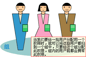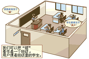 |  谈谈您的看法 | | | | | 本教程来源于《开天辟地II》。 | | ·什么是"组" 在前面我们提到过"工作组"是Windows 2000安全机制的一个部分。那么这个"组"到底是什么意思呢?在什么样的情况下我们会用到组呢? 我们可以把"组"看作是一个班级,用户便是班级里的学生。(如右图)当我们要给一批用户分配同一个权限时,就可以将这些用户都归到一个组中,只要给这个组分配此权限,组内的用户就都会拥有此权限。(如图一) 就好像给一个班级发了一个通知,班级内的所有学生都会收到这个通知一样。 "组"是为了方便管理用户的权限而设计的。(如图二) |  | 图一 | 图二 |  谈谈您的看法 | | | | |