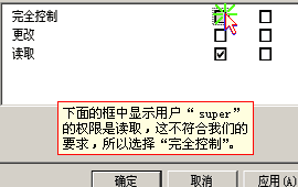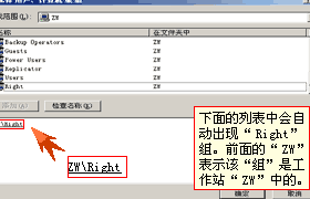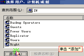 图二 | 图三 | 屏幕上弹出"选择用户、计算机或组"的窗口(如图三),和我们在前面给"组"添加成员时看到的选择窗口基本一样。仔细的观察一下它们又不一样,在上方我们可以从本机或者所在"域"内选择用户,在下面的选择列表中,还可以看到本地已有的"组"。 选择"Right"组,再单击击"添加"(如图四),下面的列表中自动出现Right组,前面的"ZW"就表示该"组"是工作站"ZW"中的。再从上面选择Super,将其也添加到下面的列表中(如图五)。选完后单击"确定"。 图四 | 图五 | 下面我们来设置权限。先选择用户"Super"(如图六),下面的框中,显示出他当前的权限是"读取",这里的"读取"权限包括,查看此目录下的文件名和子文件夹名,进入子文件夹,查看文件中的数据和运行程序。根据前面提到的需求,这里我们选择允许中的"完全控制"。(如图七) 图六 | 图七 | 我们再设置"Right"组的权限,选择"Right"组,在下面的框中可以看到默认的权限是允许"读取",符合我们的要求。现在所有的权限都设置好了,点"确定"结束(如图八)。  图八