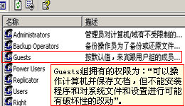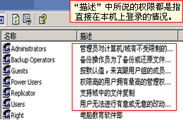 | ·什么是Windows2000的内置组 在前面创建"组"的时候,看到系统已经自动建立了一些组,那么这些组都有什么作用呢?通常我们把这些系统自动创建的"组"称作"内置组"。进入"控制面板",双击“管理工具”,打开"计算机管理"(如右图),然后打开"本地用户和组",再进入"组",我们可以从列表中看到有6个内置的组,其中Guests组,在前边我们已提到过。从旁边的描述中,我们可以知道Guests所拥有的权限:"可以操作计算机并保存文档,但不能安装程序和对系统文件和设置进行可能有破坏性的改动"。(如下图)  下面的"Users组"的权限和Guests组是一样,当新建一个用户后,该用户会自动被加入到Users组中。可能你会提出这样的问题,Users和 Guests组成员通过网络如何在Windows 2000工作站上保存文件呢? 如果通过网络登录的话,只有在授予可写权限的共享目录中保存文件。"描述"中所说的权限都是指直接在本机上登录的情况。  上面的Administrators,就是系统管理员组,在默认的情况下,只有Administrator是该组的成员。通常只有在维护计算机的时候才使用系统管理员的身份登录,也是为了保证系统的安全。 Backup Operators、Power Users、Replicator这三个组也是为维护系统而设置的。他们的权限要比Administrator低。  谈谈您的看法 |