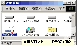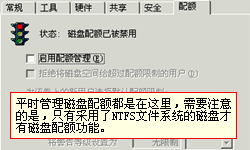 | ·何谓限量使用磁盘空间 如果你使用过NOVELL的服务器,一定记得其中有一项给不同的用户分配磁盘使用空间的设置,这样可以限制一些用户在服务器上复制大量的私人文件。 同样当多个人使用同一台Windows 2000 Professional的电脑时,也会出现因为一个用户占用了大量的磁盘空间,而导致其他用户没有空间保存自己的文件的情况。 于是在Windows 2000中添加了给用户分配磁盘空间的新特性,这个功能简称为"磁盘配额"。 先让我们打开"我的电脑"图标,选择"G盘"(如图一),单击鼠标右键,选择"属性"。在磁盘的属性窗口中可以看到多种维护和设置的功能,最后是"配额"选项卡,现在"磁盘配额"是否已经自动启动了呢?打开"配额"选项卡。 图一 |  图二 | 磁盘配额目前是禁用的(如图二),平时管理磁盘配额都是在这里,需要注意的是,只有采用了NTFS文件系统的磁盘才有磁盘配额功能。(如图三) 图三 |  谈谈您的看法 |