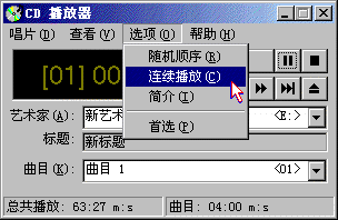 | 15、CD播放器 将一张CD放到光驱中,打开音箱,美妙动听的音乐将伴着我们走进另一片天地。 细心的您一定发现了,在Windows的任务栏上出现了一个“CD 播放器”的图标,打开它。 原来是它在为我们默默地工作着。它都为我们提供了哪些服务呢?一看这个面板,我想您已经会操作它了,这和您家里的录音机上的按键没什么区别。 对于我们比较喜欢的CD,我们可能会想来来回回地听它,那么就打开“选项”菜单,看到那个“连续播放”了吗,点一下它在它的前面就会画出一个对勾,表示循环播放,很简单的就做到了。 如果您只想听CD盘上个别歌曲,也很好办,打开“唱片”菜单,选择“编辑播放曲目”。 屏幕上出现了一个选择歌曲的窗口,您可以先单击“全部清除”,然后双击右边的曲目,在左边就出现了将要播放的歌曲,最后单击“确定”。接下来播放的就是您刚才选择的歌曲。