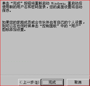 | 36、多用户的管理(二) 第四步选择可以由个人自行进行设置的项目,如果您真的是不希望别人每次都改变您的桌面或者启动菜单,最好是将这些项目全部选定。下面还有两项选择:创建当前设置的副本和创建新项目。如果使用“创建副本”,新用户登录后,其电脑设置将和现在的一模一样。 使用“创建新项目”,用户登录后,看到的将是一个全新的桌面,许多的项目都需要自己再重新设置。这里根据需要进行选择,后面您将看到不同选择后的不同结果。然后单击“下一步”。 设置完成后单击“完成”。Windows开始创建个人设置。稍后提示是否要重新启动Windows。单击“是”。 Windows 启动后,屏幕上会出现一个登录窗口,其中列有用户名,在“密码”栏输入登录密码,然后单击“确定”,此时看到的桌面便是新用户自己拥有的。不论怎样修改都不会影响其他人的设置。