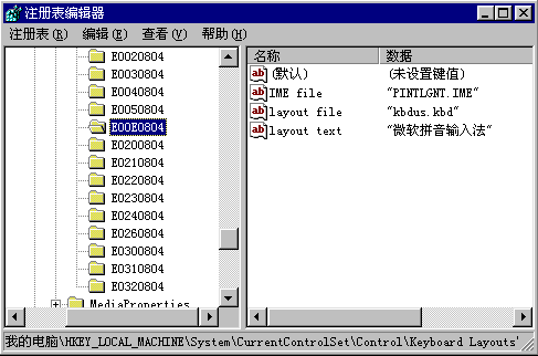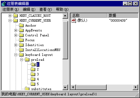 现在再依次打开注册表编辑器中的“HKEY-USERS\.DEFAULT\Keyboard layors\ Preload\",在这里,显示的是系统所安装的输入法,及顺序,如:1文件夹里是0000049输入法,2文件夹中是E00E0804输入法,这里的1,2代表的就是显示顺序,你只要在左侧选好文件夹,在右侧的窗口中,顺序地改好所代表的输入法的号,重新启动计算机后,输入法就会按你设置的顺序显示了。