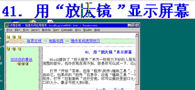 Win98提供了“放大程序”来为一些视力不好的人服务。用它可以放大鼠标指针周围的部分。也许你现在用不到,但是你可以试一下,以备有特殊用途时使用。