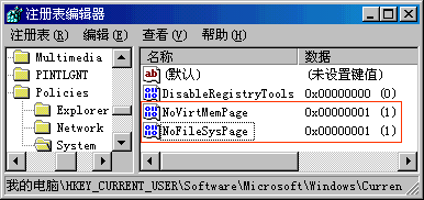 1.进入主键[HKEY_CURRENT_USER\Software\Microsoft\Windows\CurrentVersion\Policies\System]。 2.选择“新建”菜单的“DWORD值”,新建2个DWORD值,名称分别为“NoVirtMemPage”(屏蔽“虚拟内存”)、“NoFileSysPage”(屏蔽“文件系统”)。 3.将它们的值均设置为“1”。