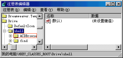 如果我们想把“ACDBrowse”选项去掉,就进入主键[HKEY_CLASSES_ROOT\Drive\shell]中,把主键“ACDBrowse”删除即可。