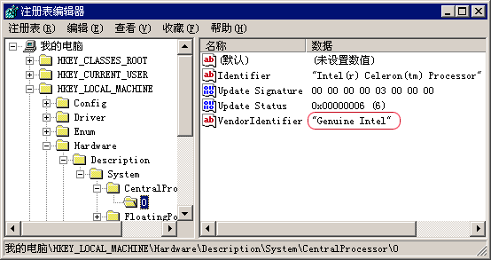 在“开始”菜单下选“运行”,键入“Regedit”, 回车进入“注册表编辑器”。 选取以下路径: HKEY-LOCAL-MACHINE\HARDWARE\DESCRIPTION\System\Central Processor\O 在“O”文件夹上按一下鼠标左键,出现一组数值资料,在“Vendoor Identifier” 一项按鼠标右键, 选取 “修改”, 在“GenuineIntel”中间加上一个空格,点“确定”。