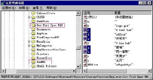 同样的方法,选择“HKEY-USERS\.DEFAULT\Software\microsoft\Windows\ CurrentVersion\Explorer\Doc Find SpecMru”,这时在窗口右侧,会显示出在“查找”下拉菜单中存储的文件名,不常用的就可删掉了。 进行完以上操作,重新启动计算机,就可以生效了。