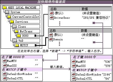 先运行注册表编辑器,打开根键“HKEY_LOCAL_MACHINE”,看,一下子出来这么多东西,跟着我一步一步的做,找到最下面一个“system”点前面的加号,将它展开,一直展开到“CurrentControlSet \Services \Class \NetTrans”,在NetTrans下有0000、0001、0002,这就是我们要找的,但是改哪一个呢?我们挨个地点0000、0001、0002,看看里面有没有“DriverDesc 、DeviceVxDs、IpAddress”如果有的话,我们在这里添加一些东西。噢,是这里,在右边窗口空处点右键,弹出一个“新建”菜单,将鼠标移到上面,点“字符串值”,输入“MaxMTU”,双击它将它的值改库536。再添加上“MaxSSS”,其值为576 用同样的方法在 HKEY_LOCAL_MACHINE \System \CurrentControlSet \Services \VxD \MSTCP的右边窗口添加上字符串值“DefaultRcvWindow”并把它的值设定为“2144”,和“DefaultTTL”并把它的值设定为“60”至“64”(注:60是最小值,64是最大值,只要填上其中一个值就可),完成後关闭注册表编辑器并重新启动Win95即可。 再上网试试,速度加快了吧。如果你下载文件的话,会让你更吃惊。
