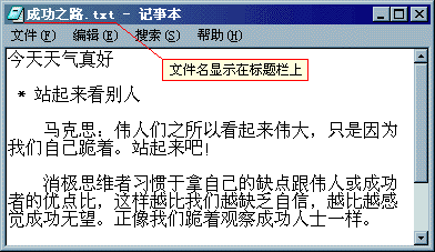 | 11、保存文件和退出 好了,关于“记事本”、键盘讲得差不多了,最后还要补充一点,就是保存信息的问题。 把鼠标移动到这个“文件”的上面,单击鼠标左键,看,出来了一个单子,上面列着几个条目。这个单子叫菜单,这个名字来源于我们日常生活中的菜单。从菜单中选择了什么功能,计算机就去完成相应的功能。 比如现在我们想要保存信息,所以就选择其中的“保存”,把鼠标移动到“保存”那一项,然后单击鼠标左键。 画面上又出现了一个新窗口,通常我们把这种窗口叫做“对话框”,一般来说,计算机都是利用对话框问我们一些问题。 首先我们要回答“文件叫什么名字”。要记住在计算机中有很多文件,如果您不知道您的文件叫什么名字,您下回怎么找到它呢?所以名字最好要有意义,一看就明白文件的内容。 取好了名字之后,用鼠标单击这个“保存”按钮。我们有遇到了一个新名词“按钮”,其实我们在启动记事本程序时,点的“开始”就是按钮。当我按下鼠标左键时,它看去就像被按下去了,当我松开鼠标左键,它又弹起来了。 现在,计算机就已经把我们输入的东西保存完了。注意在没保存之前,这个蓝条,也叫标题栏上写着“无标题”,而现在是我们刚取的文件名了。 现在我们就可以关闭记事本程序了,因为每个程序都会耗费计算机的资源的,如果很多程序都启动了却没有做任何事,计算机就会变得特别慢。 还是单击这个“文件”,然后把鼠标移动到“退出”上,再单击鼠标左键。“记事本”程序就被关闭了。