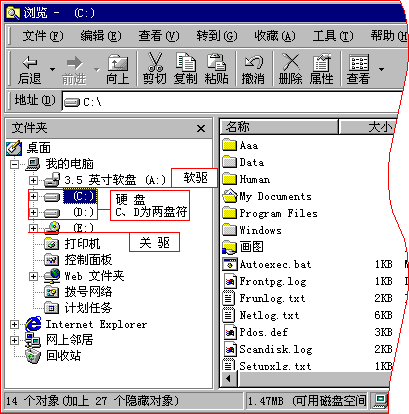 | 8、电脑中的盘符 好,我们来看看怎么用资源管理器。在窗口左边的这个框中,我们会看到这样的几个图标:这几个图标后面是字母和一个冒号,它们就叫做盘符。“A:”是软盘驱动器,就是放软盘进去的地方,后面还写着“3.5 软盘”。C:、和D:这两个图标都是一样的,它们表示电脑内部的硬盘。 这里需要注意的并不是每个硬盘的图标就表示电脑内的一个硬盘?有时一个硬盘可以分成几个部分,每一个部分都是独立的,每一个部分都叫做电脑的一个分区,都用不同的图标来表示。也就是说虽然这里有好几个代表硬盘的图标,实际上在电脑内部可能只有一块硬盘。 ◎ 一块硬盘可以分成几个区。 软盘是A:,硬盘是从C:开始的,怎么没有B:呢?一般人们把A:和B:这两个盘符都留给软盘驱动器,也就是说,一台电脑上最多可以装两个软驱。 但如果电脑上只装了一个软驱,比如占用了标号A:,电脑也会把另一个盘符B:留出来,所以硬盘的盘符总是从C:开始的。 ◎ 硬盘盘符总是从“C”开始的。 这个上面有光盘的图标的就是光盘驱动器,它的盘符是硬盘盘符的最后一个字母的下一个字母。比如说硬盘占用了C:、D:,光驱就是E:,如果硬盘只占用C:,那么光驱就是D:。光驱的盘符是由电脑自动分配的。 ◎ 总结:我们用A:和B:来表示软盘驱动器;硬盘的盘符从C:开始往后,每个分区用一个不同的字母来表示;光盘驱动器的盘符是紧接在硬盘最后一个盘符后面的字母。 假设一部电脑有两个软驱,硬盘被分成了三个区,还有一个光驱,您来考虑一下,它们应该都叫什么盘呢? 应该是A:和B:为软驱,C:、D:、E:为硬盘的三个分区,F:为光驱。