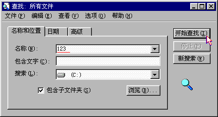| 22、查找文件和文件夹 弄懂了文件的概念,再学习电脑就非常容易了。硬盘上这么多的文件夹和文件,如果我们要找一个文件,却忘记了它在哪个文件夹里,是不是很可怕? Windows 98特地为我们设置了“查找”功能,可以使我们轻而易举地找到想要的文件或文件夹。 在资源管理器中,单击菜单栏上的“工具”,选择“查找”。此时在屏幕上出现一个查找文件的对话框。在这个名称栏里输入要查找的文件名,在这里选择要在哪个盘上查找,再单击“开始查找”按钮,系统就会在电脑中搜索文件了。 如果找到了,这里就会列出文件名及所在位置,您就可以根据自己的需要操作了。 可是很多情况下,我们并不能记得这么多的文件名,那我们该怎么办呢?没关系即使您记不全文件名,只记得一部分也可以进行查找,电脑会把文件名包含这部分的所有文件都找出来列出来。您再从里面找就好找多了。 而且,在“查找”的时候,可根据文件名、目录、文件修改日期、文件大小、文件关键字等各种信息组合查找。