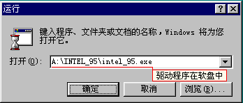 | 2、安装主板驱动(二) 那么,又应该怎么去安装这些驱动程序呢? 我们先安装主板驱动,打开“开始”菜单里的“运行”,单击“浏览”,找到A盘,里面有一个“Intel_95”的目录,选中intel_95.exe后按“打开”,然后点“确定”,这时会出现一个DOS窗口。 程序运行时询问你的Windows目录是否为“C:\Windows”,一般我们安装Windows时,这个目录为默认目录,敲入“Y”,程序开始更新你的系统了。程序运行完了,接着提示你需要重新启动计算机更新你的系统。 重新启动后,主板的驱动就安装好了。