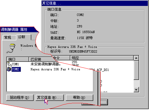 现在就可以检测一下MODEM。打开“控制面板”,在“调制解调器”上双击,单击“诊断”,MODEM已经连接在COM2上了,用鼠标点一下COM2,再点一下“其它信息”。 窗口里显示的就是MODEM的检测结果。没有提出出现错误就说明MODEM已经安装好了。 上一节 下一节