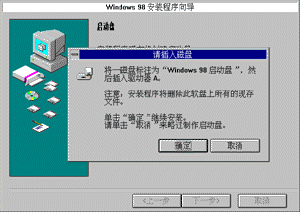 现在要制作启动盘了。启动盘的用处可大了,如果以后启动 Windows 98遇到困难,或者重新安装系统时,都会用得着。