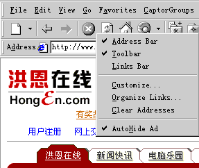四.其他操作技巧 1.方便的右键功能 Netcaptor5.5提供了强大的鼠标右键功能,在程序窗口的不同位置按下鼠标右键会弹出不同的快捷菜单,就象windows或office中的快捷菜单一样使用非常方便。在浏览窗口的下方的窗格上右击鼠标,会弹出一个如图13的快捷菜单,从中我们可以选择关闭当前窗格或关闭全部窗格以及窗格锁定等等。 图13 在菜单栏或工具栏上按下鼠标右键则会弹出如图14的快捷菜单,其中除了前面介绍的“AutoHide Ad(自动隐藏广告)”选项外还有“Address(地址栏)”、“Toolbar(工具栏)”、“Links Bar(链接栏)”等6个选项,用户可以根据自己的需要或习惯定制自己的窗口显示风格。
