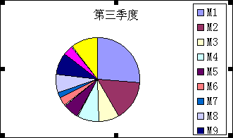 | | | 建立图表 | | 图表在数据统计中用途很大。我们拿一个例子来讲吧:这是一个市场调查表,显示了几种品牌的饮料在各个季度的销量百分比。 我们来做一个表示第二季度的几种商品所占比例的饼图,打开“插入”菜单,单击“图表”命令,打开“图表向导”对话框,第一步是选择图表的类型,我们从左边的“类型”列表中选择“饼图”,从右边的“子图表类型”列表中选择默认的第一个,单击“下一步”按钮。 | | 出现步骤2的对话框,这个对话框中要为饼图选择一个数据区域:单击“数据区域”输入框中的拾取按钮 ,对话框缩成了一个横条,选中“二季度”下面的这些数值,然后单击“图表向导”对话框中的返回按钮,回到原来的“图表向导”对话框,从预览框中可以看到我们设置的饼图就已经有了一个大概的样子了,单击“下一步”按钮。 |  | | 现在要设置图表的各项标题,因为饼图没有X、Y轴,所以只能设置它的标题,设置它的标题为“二季度”,单击“下一步”按钮。 |  | | 这一步是选择生成的图表放置的位置,选择“作为其中的对象插入”,单击“完成”按钮;饼图就完成了。 | |  | | 这样一张图表就做好了。 |  |