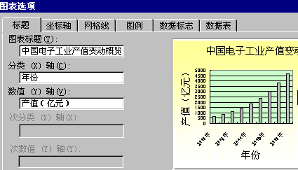 | 字体已经设置合适了,下面我们再给图例也添加上一个阴影,在图例上单击鼠标右键,选择“图例格式” ,屏幕上出现一个对话窗,样子和刚才的“图表区格式”窗口很相似,可以设置边框和区域的颜色,这里我们单击“边框”栏中的“阴影”,将其选定,然后单击“确定”。立刻在“图例”下面就添加了一个阴影。 现在看上去图表已经美观多了。 设置图表的标题,现在图表中的横轴和纵轴还缺少相应的标题说明,下面我们就补充这两个标题,在“图表区域”上单击鼠标右键,从快捷菜单中选择“图表选项”。屏幕上弹出对话窗,首先看到的是“标题”选项卡,在“分类(X)轴”栏中输入“年份”,在“数值(Y)轴”栏中输入“产值(亿元)”,然后单击“确定”。 Excel会在默认的位置上添加上横轴和纵轴的标题,标题(与配音一致)字体的大小也可根据需要来更改,方法和更改坐标轴中的字体相同。只需单击“标题”然后,在“字号”栏中输入或选择合适的字号即可。 |