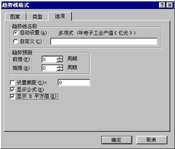 在统计应用中,我们可以使用前期的数据获得回归分析的方程式和R2值,通过方程式可以预测下一个时间点的数据情况。 双击图表中的“趋势线”,打开格式设置窗口,单击“选项”选项卡,单击下方的“显示公式”和“显示R平方值”,然后单击“确定”。