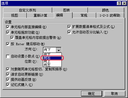 如果要转到右边的单元格,能不能实现呢? 打开“工具”菜单,选择“选项”命令,单击“编辑”选项卡,多后从“方向”下拉列表框中选择“向右”,单击“确定”。