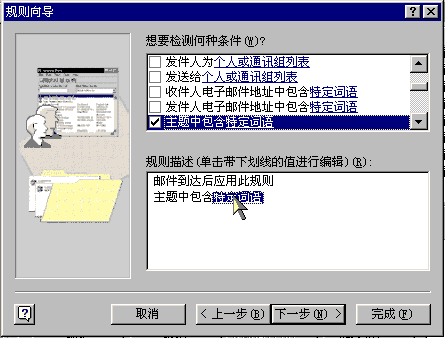 单击“新建”按钮,在“想要检测何种条件”列表框中选择“邮件到达时检查”,单击“下一步”按钮,选择“主题中包含特定词语”,在规则描述中单击“特定词语”下划线蓝色文字,这时会弹出“查找文本”对话框,我们在“添加新条件”文本框中输入“销售”,单击“添加”按钮。