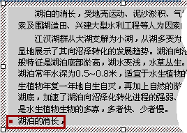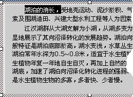 | PowerPoint 2000 |  | | 一、学做一个演示文稿 二、建立演示文稿 三、幻灯片的编辑 1.文本的复制和删除 2.剪贴板的应用 3.查找与替换 4.撤消和重做 5.补充内容 四、设置幻灯片格式 五、幻灯片视图 六、优化幻灯片工具 七、演示文稿的修饰 八、表格的处理 九、图形对象的使用 十、插入其他对象 十一、幻灯片的放映 十二、处理超级链接 十三、幻灯片的其他内容 十四、提高制作水平  谈谈您的看法 | | 1、文本的复制和删除 在建立演示文稿过程中,总要对它进行编辑。 文字处理的最基本编辑技术是删除、复制和移动等操作。在进行这些操作之前,您必须选择所要编辑的文本。 把光标放在选择文本的开始处,按下左键,拖动鼠标到要选择文本的结尾处,然后释放鼠标。(如左图) 看,文字变成反白,表示文本已经选中了。 用鼠标拖动来选择文本的方法是最常用的。 把光标放在文本框中的文字内,用鼠标双击,这时您选中的是一个字、词组或单词; 连续三击鼠标左键,可以选中整段文本; 如果想选中所在文本框中的所有文字,就按一下 Ctrl+A键。 如果要删除这些文本,您可以按一下键盘上的 DEL键,文本就被删掉了。 同样,按一下“常用”工具栏上的“剪切”按钮 ,文本也被删掉了,而且这时剪切下来的文本还被保存到了剪贴板上。 如果选中要删除的文字后,直接输入新的文本,这时既删除了所选文本,又在所选文本处插入了新的内容。 您可以靠Backspace键和Delete键来分别删除光标前面和后面的文本,但按一下键只能删掉一个字符。 在一个文稿中,总有许多内容相同或相似的地方。 复制,就是把选择的文本保存在剪贴板中,然后在需要的地方进行粘贴,利用复制和粘贴可以节省大量重复性劳动。 在上面图中,选中“湖泊的消长”这行文字,按一下工具栏上的“复制”按钮 ,把鼠标在这一段下面点一下,选择工具栏上的“粘贴”按钮 ; 看,文本被复制过来了(如右图)。 移动文本与复制文本比较类似,区别在于它删除了原来所选的文本,从另一个角度看,它是剪切和粘贴的过程。 移动文本还有一种方法,先选定要移动的文本,再把光标移到选定文本上,当光标变成箭头形状时,按下左键并拖动到要放置文本的位置释放鼠标,文本就过来了。 实现这些操作的方法很多,比如用菜单命令啦,用鼠标右键啦,这些您都可以试一试。 但有一点要告诉您,剪切、复制、粘贴有三个快捷键: 分别是Ctrl+X、Ctrl+C和Ctrl+V,记住了这三个快捷键;这三个快捷键是Win98里通用的快捷键,也就是说在其它应用程序里,您也可以利用Ctrl+X、Ctrl+C和Ctrl+V来完成剪切、复制和粘贴操作。 上一节 下一节  谈谈您的看法 |