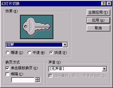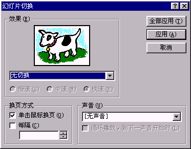 如果还没看清效果,就再点一下上面的图片,效果就又演示一遍。下面的切换速度已经变成可选状态了。选一下“中速”,再选一下“快速”,效果是不一样的。如果不进行设置,缺省状态为“单击鼠标换页”,也就是在幻灯片放映过程中,点一下鼠标,幻灯片就换到下一页,同时显示换页效果;如果在复选框上点一下,取消了“单击鼠标换页”,那在放幻灯片时,点一下鼠标,幻灯片就不会换到下一页。还可以不用任何操作,就换到下一页。,选取换页方式中的间隔,然后在下面的文本框中输入一个时间,我们输入2,(如图5)那么幻灯片放映时,隔2秒钟它就会自动切换到下一页。