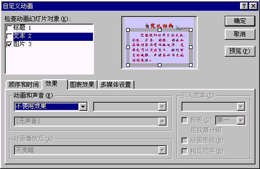 就得到了从中间向左右展开的动画。我们可以预览文本及对象的动画效果,观察它们如何工作,并随时调整,直到满意为止。其它对象也能设置动画,幻灯片里的所有对象都能设置动画。在“检查动画幻灯片对象”列表框中列出了本页幻灯片中所有对象的名称(如图4),处于选中状态的就是已经设置了动画的,刚才这个文本框前已经打了个勾,说明它已有动画了。我们再选中另一个对象,这时右面的图形中就标明了是哪个对象被选中。(如图5)